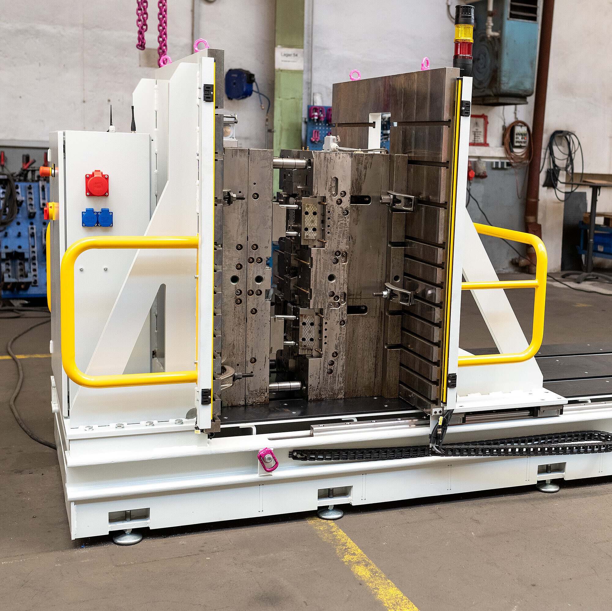 Der RUD TECDOS TS wird als individuelle Sonderanfertigung konstruiert. Der Werkzeugöffner in seiner Standardausführung ist ausgelegt für Werkzeuge bis zu 10 Tonnen, aber auch leichtere oder schwere Tools sind problemlos möglich. Der Werkzeugöffner hat eine 1.300 mm x 1.300 mm große Aufspannplatte, eine 380 mm hohe Gleit- und Auflagefläche. „Im Prinzip ist hier alles möglich: Wir können kleinere und größere Gewichte, Kräfte und Distanzen zwischen den Aufspannplatten handhaben. Auch die Platten selbst können wir je nach Anforderung verändern“, betont Lais. Für einen flexiblen Einsatz im Betrieb ist der RUD Tecdos TS mobil per Kran verfahrbar.